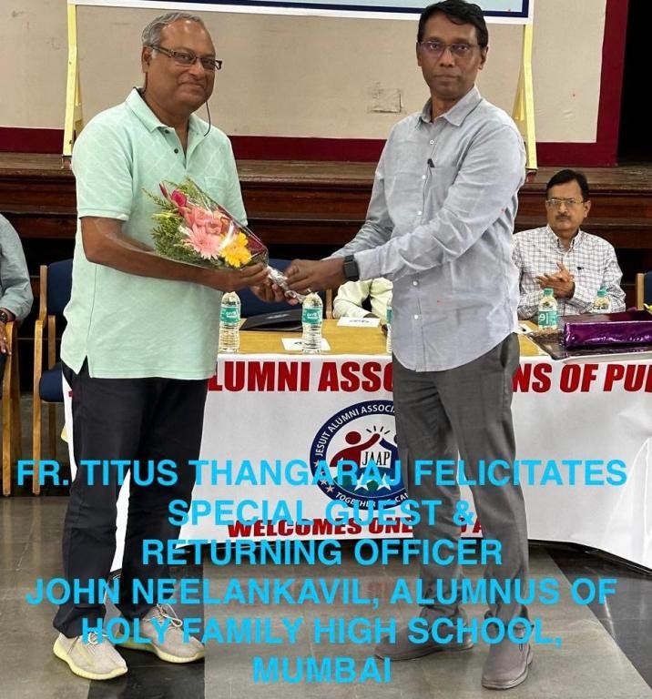 The meet was attended by Prominent Personalities from Mumbai and we were privileged to felicitate them by the respective Jesuit Dignitaries present, namely Mr. John Neelankavil, an alumnus of Holy Family High School, Andheri-Mumbai, a founder member of the school alumni association (HyFyXS) that was formed in 1999, he has served in Jesuit Alumni Associations since 2003 at various levels viz-Bombay Province, JAAI WZC, JAAI GC and also the WUJA council. On request by Rev. Fr. Francis Patekar SJ, PCA-Pune Province, Mr. John had consented to share his expertise on the election process and in conducting the elections as the Returning Officer.
